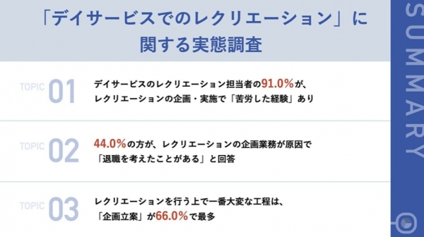 ホーム > オフマガ ニュース一覧 > デイサービスのレクリエーション担当者の91.0%が「レクリエーション」の企画に苦労した経験あり うち、44.0%が、企画業務が理由で「退職」を検討