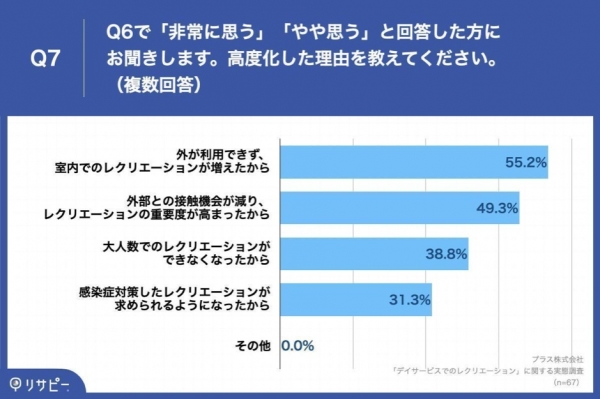 「Q7. Q6で「非常に思う」「やや思う」と回答した方にお聞きします。高度化した理由を教えてください。(複数回答)」(n=67)と質問したところ、「外が利用できず、室内でのレクリエーションが増えたから」が55.2%、「外部の接触機会が減り、レクリエーションの重要度が高まったから」が49.3%という回答となりました。