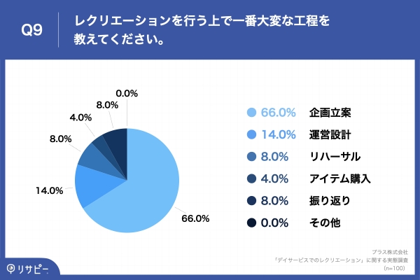 「Q9. レクリエーションを行う上で一番大変な工程を教えてください。」(n=100)と質問したところ、「企画立案」が66.0%、「運営設計」が14.0%という回答となりました。