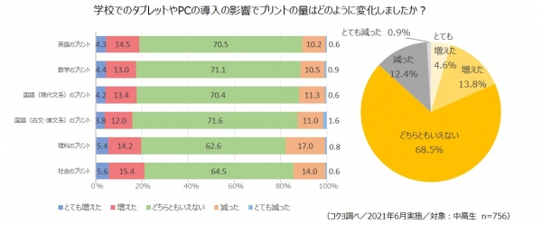中高生を対象にしたコクヨの調査(2021年6月/n=756) によると、タブレットやPC導入の影響によるプリント量の変化は、87%が、「どちらともいえない」「(とても)増えた」との回答となっています。 学生の学習アイテムは、教科書やノート、参考書、今まで通りのプリント量に加え、新たにPCやタブレットが増えることで、机上のスペースが狭くなったり、通学時の持ち運びのアイテムが増え、身体的な負担への不安の声も挙がっています。