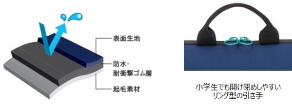 耐水性・耐衝撃性の高い生地と止水ファスナーを採用しているので、ランドセルの中でも揺れなどの衝撃に強く、浸水からもPC・タブレットを守ります。また、外側はポケット等のないフラットな形状にし、ランドセルからの出し入れがしやすい設計となっています。さらに、開口部が大きく開き、端末が入れやすいL字型ファスナーと、小学生でも開け閉めしやすいリング型の引き手を採用しています。