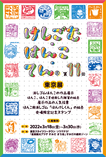 「第11回けしごむ・はんこ・てん 東京展」(主催・消しゴムはんこ協会 H.K.club)が、3月18日から3月30日まで、東京スカイツリータウン・ソラマチ5F「産業観光プラザ すみだ まち処」すみだの歳時ゾーンで開催。監修ヒノデワシ㈱。