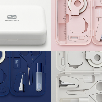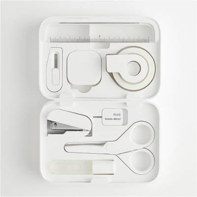 8つのアイテムをコンパクトなケースに収納したステーショナリーセット。1984年に累計約650万個を売り上げた大ヒット商品が生まれ変わりました。デジタル化が進む中、思わず手に取りたくなる文具を目指し、「切る・貼る・綴じる・測る」という文具の本質を追求した“あるとうれしいアイテム”を厳選。プラスの技術とプロダクトデザイナー深澤直人氏のデザインの力が融合し、ディティールにまでこだわった美しいデザインへと仕上げました。
