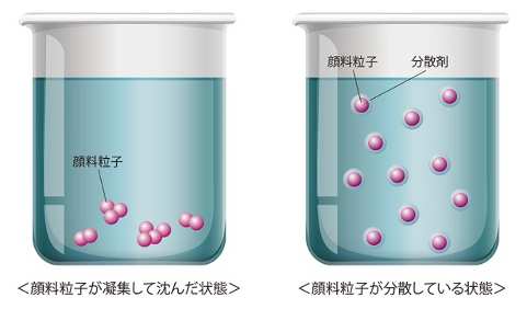 高品質な水性顔料インクジェットインクの製造には、インク中の顔料を安定的に分散する技術が不可欠です。一般的に、インク中の顔料粒子サイズは100nm前後であり、時間が経過すると複数の顔料粒子が凝集し沈殿します。これは印刷時にインクジェットヘッドのノズル詰まりに繋がるため、インク中の顔料粒子は均一かつ安定的に分散している必要があります。また、高速で高品質な印刷が求められるインクジェット印刷では、色材に加えてインクに様々な溶剤や機能性材料が用いられるため、色材が他の材料の影響を受けずに安定性が維持されることが重要となっています。
