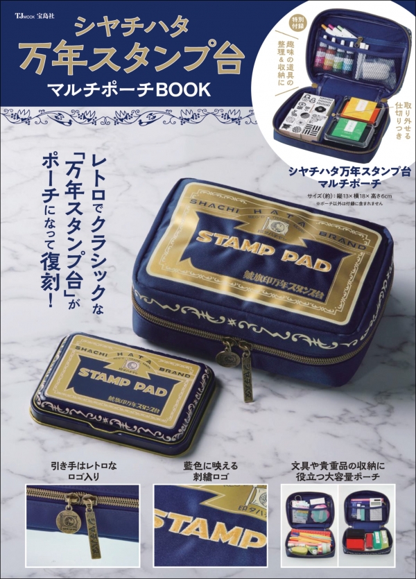 朱肉のいらないはんこやスタンプパッドが人気のメーカー「シヤチハタ」が、宝島社の「人気文具付録」シリーズに初登場。特別付録は、シヤチハタ創業当時の「万年スタンプ台」のデザインをモチーフにしたマルチポーチです。