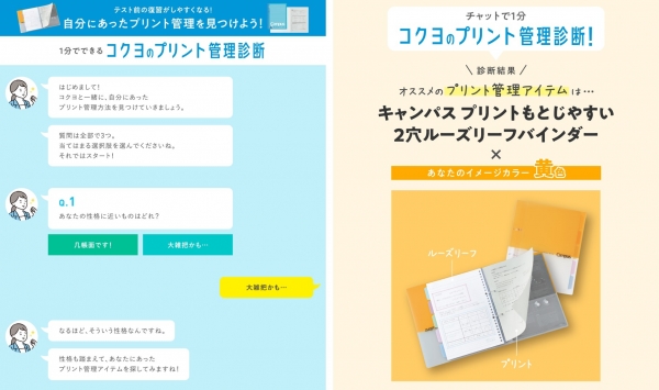 チャットアプリの会話風の画面で、いくつかの簡単な質問に答えると、自分に合ったプリント管理方法のワンポイントアドバイスや、おすすめ文具、あなたのイメージカラーが分かります。