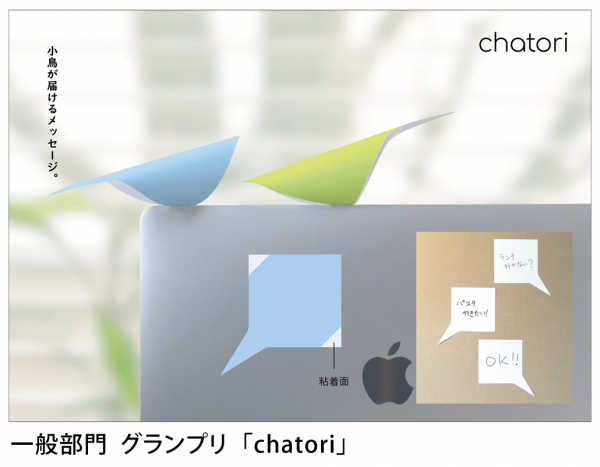 一般部門グランプリを受賞した『chatori』は、ふせんを丸めて両端の粘着面を貼り付けることで小鳥の形になりメッセージを届けてくれるというふせん。開いて貼り付ければ吹き出しの形になり手書きのチャットになるというアイデアです。本作品は「くすっ」というお題に微笑みを誘うような作品で、鳥は一つのメタファーとしてメッセージを届けるという意味もあり、広げると吹き出しの形に見えてチャットツールのようになっているなど、2重の意味を持たせている点などが高く評価され受賞しました。