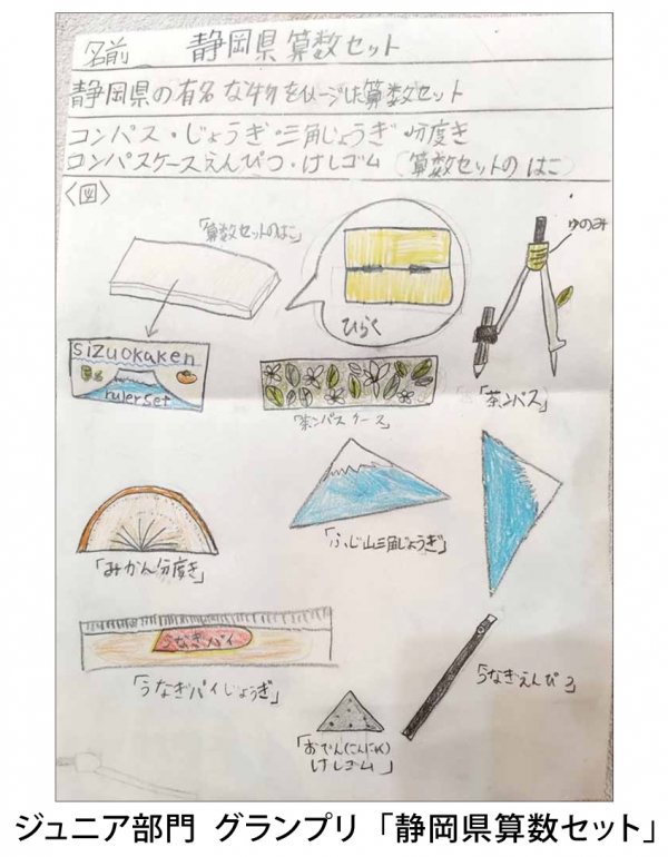 ジュニア部門グランプリを受賞した『静岡県算数セット』は、静岡県の有名な物をイメージして作った算数セット。受賞者の地元、静岡県を想いながら元気に算数を頑張りたい!というアイデアです。静岡名物のお茶や富士山・うなぎパイなどが文房具になっており、静岡愛に溢れた作品がテーマ「くすっ」にぴったりと評価され受賞しました。