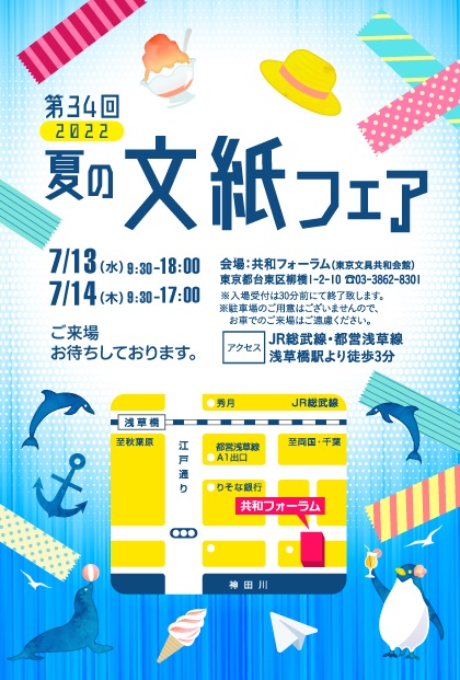 「第 34 回 2022 年夏の文紙フェア」が、新型コロナウイルス感染予防策徹底のうえ2022年7月13日(水)~14日(木)まで、東京・台東区の共和フォーラムで開催。