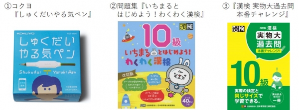本調査では、抽選により選ばれた調査協力者(モニター)には、①コクヨ『しゅくだいやる気ペン』、②問題集『いちまるとはじめよう!わくわく漢検』、③『漢検 実物大過去問 本番チャレンジ!』を提供し、初めての漢検受検に向かって家庭学習を実施して頂きました。