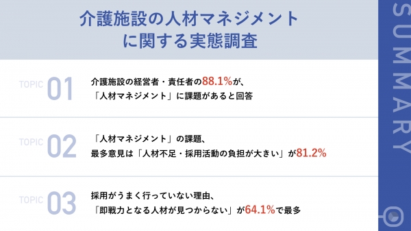 ホーム > オフマガ ニュース一覧 > プラス、介護施設の経営者・責任者、88.1%が「人材マネジメント」に課題を実感 「人材不足・採用活動の負担が大きい」が最多で8割以上