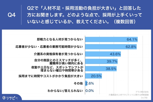 まず、介護施設の経営者・責任者の88.1%が「人材マネジメント」に課題があると回答しました。「人材マネジメント」の課題として、最も多かったのは「人材不足・採用活動の負担が大きい」で81.2%が回答。他にも「優秀な人材から辞めていく」や「急な休みに対応する人が限られてしまう」といった課題の声も挙がりました。「人材マネジメント」の課題として「人材不足・採用活動の負担が大きい」と回答した経営者に、採用がうまく行っていない理由を伺うと、「即戦力となる人材が見つからない」が64.1%で最多、次いで「応募者が少ない・応募者の業務可能時間が少ない」が62.8%、他にも「勤務時間の融通が利かない」や「求められる能力と求める給与のギャップ」などの理由が挙がりました。