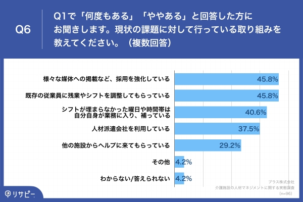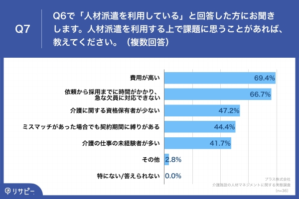 次に、課題に対しての取り組みを伺うと、「様々な媒体への掲載などで採用強化」、「既存の従業員で残業やシフトの調整」がそれぞれ45.8%で最多、「人材派遣会社を利用している」が37.5%でした。人材派遣を利用している経営者へ、人材派遣を利用する上での課題を伺うと、「費用が高い」(69.4%)や「依頼から採用までに時間がかかる」(66.7%)、他にも「協調性、技術力等で物足りない」や「たくさんの媒体で募集をかけないと人が集まらない」などが挙がりました。