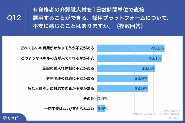 そこで、「有資格者の介護職人材の採用プラットフォーム」について伺うと、6割以上が興味を示しました。興味がある理由については、「必要な時間だけ仕事が依頼できるので費用が抑えられそうだから」が62.9%で最多、「資格者の急な人員不足に対応できそうだから」が55.7%の結果になりました。他にも「コアタイムだけ雇用できれば費用が抑えられる」や「即戦力の有資格者は歓迎」などの期待する声が多数挙がりました。一方で、採用プラットフォームについて、「費用」や「人材スキル」に不安を感じるという声も約4割に上りました。
