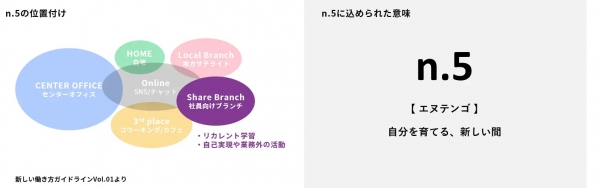 Life Based WorkingⓇという新しい働き方について、2000名弱の全社員向けにアンケート調査を定期的に実施しております。最新の調査結果では、働くことに対してのポジティブさを確証したと同時に、テレワークによって増えた可処分時間を活用するための「個人として新しくチャレンジしたい事がある」という声もたくさん集まりました。そこで、今回、社員たちを応援するために、「n.5(エヌテンゴ)」を開設。「自分を育てる、新しい間(ま)」をコンセプトに、1stプレイス(自宅)、2ndプレイス(オフィス)、3rdプレイス(カフェ、コワーキング)といった区分に縛られず、目的に応じて自在に使いこなせる場所にしたいという想いを込めて、1.5や2.5など、物ごとの「あいだ」を思い起こさせるネーミングとしました。