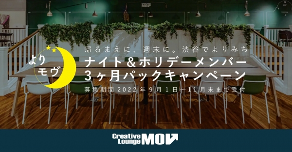 渋谷ヒカリエのメンバー制コワーキングスペースCreative Lounge MOV(本社:大阪市/社長:黒田 英邦)は、2022年9月1日(木)〜2022年11月30日(水)まで、【ナイト&ホリデーメンバー3ヶ月パックキャンペーン】を開催します。