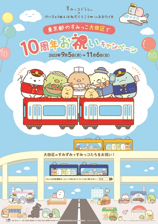 人気キャラクター“すみっコぐらし”を手がけるサンエックス株式会社(本社:東京都千代田区,社長:千田 洋史,以下 サンエックス)と,京浜急行電鉄株式会社(本社:横浜市西区,社長:川俣 幸宏,以下 京急電鉄),日本空港ビルデング株式会社(本社:東京都大田区,社長:横田 信秋,以下 日本空港ビルデング),大田区(区長:松原 忠義)は,以下7者を含む10者連携で,2022年9月5日(月)から11月6日(日)まですみっコぐらし×けいきゅう&はねだくうこうinおおたく「東京都のすみっこ大田区で10周年お祝いキャンペーン」(以下 本キャンペーン)を実施します。