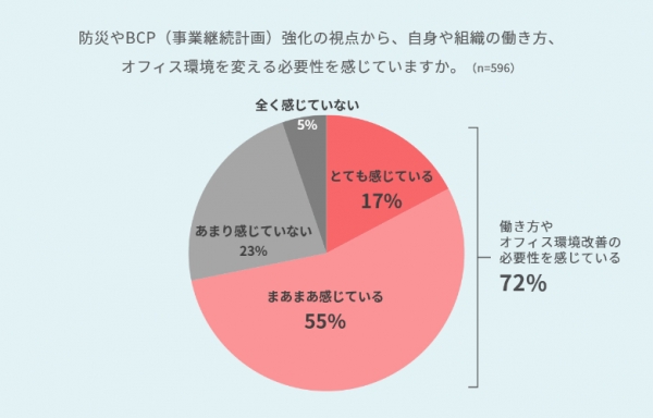 ・地方自治体職員へアンケート調査を行った結果、7割以上が防災やBCP(事業継続計画)強化の観点により、働き方やオフィス環境改善の必要性を感じているという回答が得られました。とくに、「レイアウトの柔軟性」「通路幅の充分な確保」に関して重要度と満足度の差が大きいことが分かっており、現在のオフィスでは非常時の安全確保や迅速な対応に関して強い課題があると推察できます。