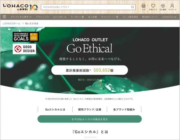 2019年11月より開始したGo Ethicalの取組みは、商品の廃棄ロスを削減するとともに、購入しやすい価格で販売することで新たなお客様の獲得も目指す LOHACO が考える“プロダクト・ライフサイクル”を理想の形にする施策です。店頭での品揃えの変更や通常販売の時期が終了したこと等を理由に従来は廃棄されていた商品をGo Ethicalで販売することでブランド価値を損なうことなく、廃棄ロスを削減することが可能となります。開始以降、27社のメーカーに参画いただき、これまでの累計廃棄削減数(※)は「503,652個」(2022年9月20日時点)を実現しています。