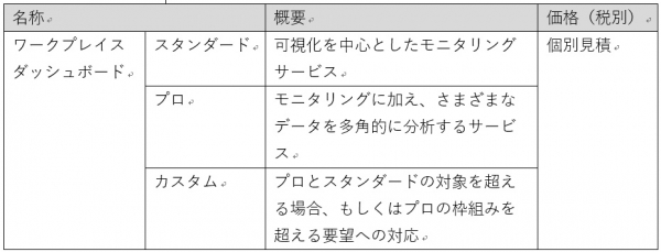 今回、当社が培ってきた様々な取り組みのノウハウをもとに、働き方データの可視化、コンサルタントによるデータ分析、オフィスの改善提案など顧客企業からの独自要望への対応の3つのメニューをそろえた「ワークプレイスダッシュボード」の提供を開始します。「オフィス内の各空間が効率よく利用されているか知りたい」、「オフィスを改善するにあたり根拠となる材料がほしい」といった声にお応えします。
