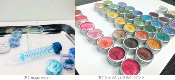 モーンガータはこれらの課題に対して、廃棄される化粧品バルクを自社特許技術であるmagic waterを用いて、絵の具・墨汁などの画材としてだけでなく、ジェルネイル・アクセサリー・キーホルダー・キャンドル・レンガなどの雑貨創作に活用できる色材(SminkArt® ときめくペイント)を開発し、提供してきました。このように様々な用途で使用できる上に、化粧品からできていることから肌付着時のリスクも低く、さらには既存の色材にはない化粧品特有のニュアンスで表現できることから、その需要は高まっています。