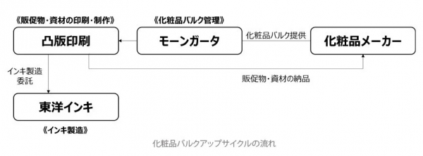 モーンガータは、化粧品メーカー各社(現在7社)から不要となった化粧品バルクや製品、化粧品小売店舗から廃棄予定の化粧品テスター、百貨店などで回収された一般消費者の廃棄化粧品を収集し、一括管理しています。印刷用インキ化においては、廃棄される化粧品バルクの管理ハブとしての役割を担い、印刷用インキ化に適したバルクを凸版印刷に調達します。さらに、凸版印刷が東洋インキに委託し製造したインキを用いて販促物・資材などを制作し、化粧品メーカーに販売します。