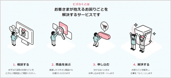 また、ソフトバンクのマーケティングやシステム開発の担当者が本事業に協力する他、顧客サポートなどの知見やノウハウを提供します。さらに、ソフトバンクのグループ会社であるSBエンジニアリング株式会社(以下「SBエンジニアリング」)が、「ビズらく」のサービスの一つである、情報システム部門の代行サービス「みんなのITサポート」の提供および運営を行い、システムに関する中小企業の悩みを解決できるようにサポートします。