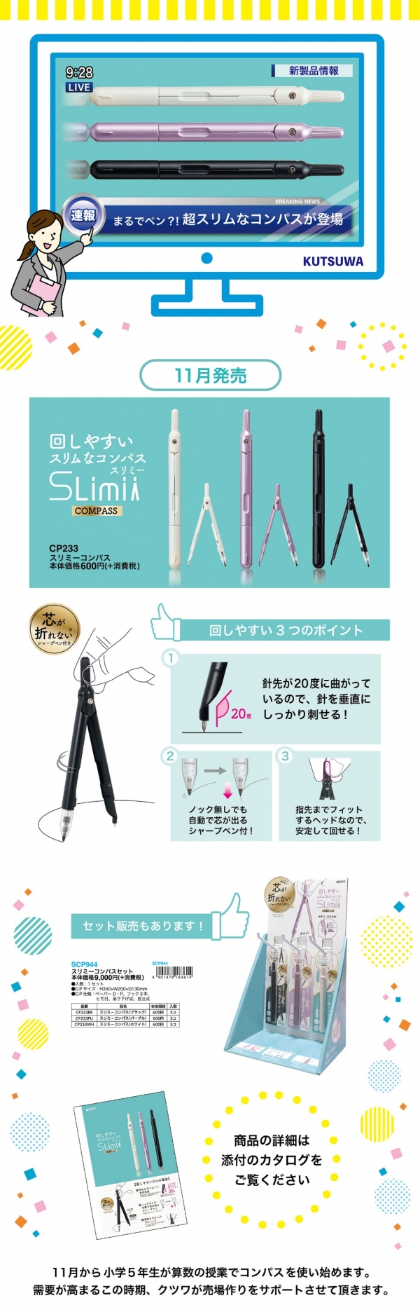 クツワは販売促進の一環でダイレクトメール配信11月は、11月新製品の超スリムな回しやすいコンパス「スリミーコンパス」を紹介している。