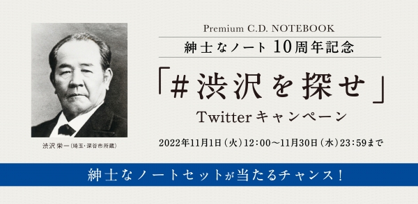 この度、紳士なノート発売10周年を記念し「#渋沢を探せ Twitterキャンペーン」を本日2022年11月1日より実施いたします。また、本キャンペーンに合わせ、プレミアムCDノートについている帯のデザインの紳士が“渋沢栄一”になった特別版が店頭に並びます。