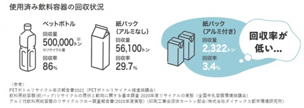 第一弾として提供するサービスのなかでも、とりわけ注力するのが市場全体で回収率が低い紙パックと紙コップのリサイクルサービス「Loopa Drink (ルーパ・ドリンク)」です。紙パック、紙コップは、含まれるパルプ以外の原材料を除去し、再資源化できる工場が少なく、リサイクルの禁忌品として扱われ、その多くは燃えるゴミとして焼却処分されているのが現状です。各自治体においても、紙パック、紙コップは再生利用可能な産業廃棄物または一般廃棄物(通称「専ら物」)としての扱いがされないケースが多く見受けられます。(当社調べ)また、近年デジタル化などを背景に企業から排出されるコピー用紙などの洋紙系古紙が減少傾向にあり、古紙を原料とした家庭紙の原料不足という問題も浮き彫りになっています。
