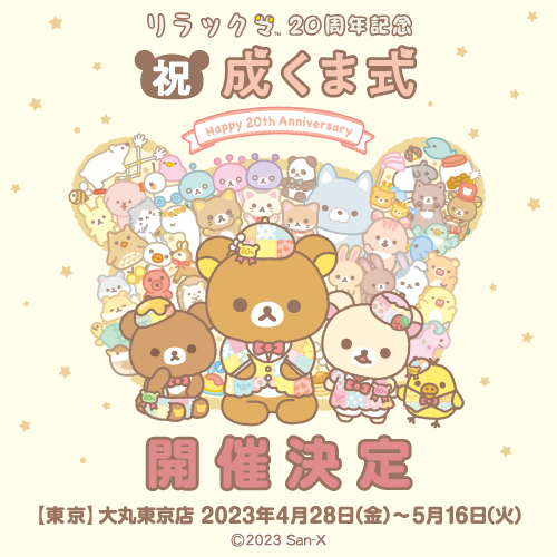 サンエックス株式会社(本社:東京都千代田区、代表取締役社長:千田 洋史)は、人気キャラクター「リラックマ」が今年20周年を迎えるのを記念し、2023年4月28日(金)~5月16日(火)の期間に大丸東京店にて『祝・成くま式』が開催されることをお知らせします。