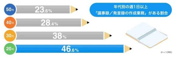 また、週1日以上議事録/発言録の作成業務がある割合を年代別に比較すると、20代が最も多く、若手社員が作成業務を担っていることがわかります。