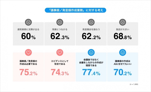 議事録/発言録に対して「作成は必要」「エビデンスとして有効」と回答した人は、いずれも7割超。その一方で「通常業務に支障が出る(60%)」、「作成業務が残業につながる(62.3%)」、「作成業務を担当すると発言機会を損なう(62.2%)」、「作成業務の負担が大きい(68.8%)」など、業務改善への課題感が見てとれます。また「会議をしながらの作成が理想」「作成はAIに任せてもいい」など、DXによる作成業務の効率化への期待も感じられます。