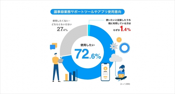 議事録/発言録の作成業務において、サポートツールやアプリの使用意向を聞いてみると、72.6%の人が使用したいと回答しています。しかしながら、使用したいと回答した方のうち、既に利用している方は、わずか1.4%と需要と実態に大きな乖離が発生していることがわかりました。