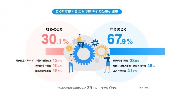 DXを実現することで期待する効果や成果についてたずねてみると、67.9%がコスト削減や業務効率化などの「守りのDX」に期待していました。新規顧客の獲得や新規事業の創出等の「攻めのDX」だけでなく、「守りのDX」も両輪で推進し、企業の生産性を向上させることが重要だと考えられます。