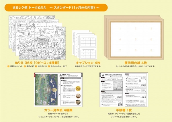 セット内容:ぬりえ4種、展示用台紙4枚、キャプション4枚、カラー見本紙4枚、手順書1枚