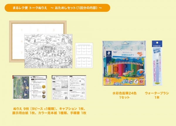 セット内容:ぬりえ1種、展示用台紙1枚、キャプション1枚、カラー見本紙1枚、手順書1枚、水彩色鉛筆24色1セット、ウォーターブラシ1本