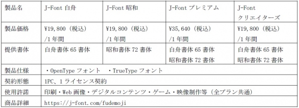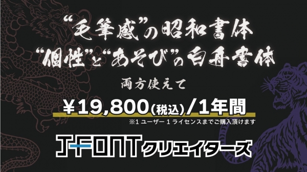 さらに、より多くのクリエイター様や企業様に、気軽に筆文字をお使いいただけるよう、白舟+昭和の全137書体が驚愕の価格据え置きの年間19,800円(税込)で利用できる「J-Fontクリエイターズ(1ユーザー1ライセンスまで)」をリリースします。使用許諾範囲も他のプランと共通仕様のため、安心してご利用いただけます。