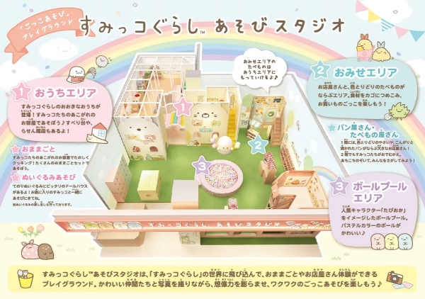 『すみっコぐらしあそびスタジオ ららぽーと門真』は「すみっコぐらし」たちと一緒に“ごっこあそび” ができる、3つのエリアで構成されています!