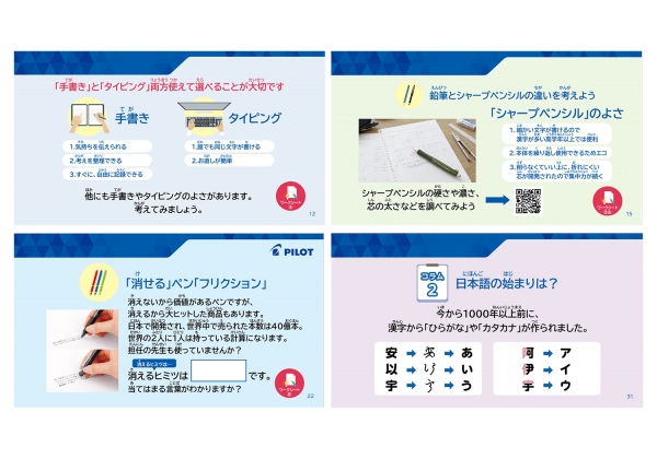 プログラムはタブレット端末なども併用しながら、手書きとタイピングそれぞれの良さを理解し、その適切な使い分けや、日本語の歴史や文化についても学ぶことができる内容となっています。小学校などで1~2時間で学習できる構成で、指導用スライド及び指導案、児童が使うワークシートが無料で提供されます。また実践用教材として先着100クラスに、当社の消せるボールペン「フリクションボールノック」を授業に参加する児童に1本ずつ、消せる蛍光ペン「フリクションライト6色セット」を教員用に提供します。