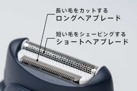 長い毛をカットする「ロングヘアブレード」と、短く残った毛を剃る「ショートヘアブレード」の2種類のブレードが1つになっています。切れ味の良いステンレス複合ブレードにより、面倒な下準備やケアのための補助アイテム不要で、手軽で簡単にムダ毛をカットすることができます。