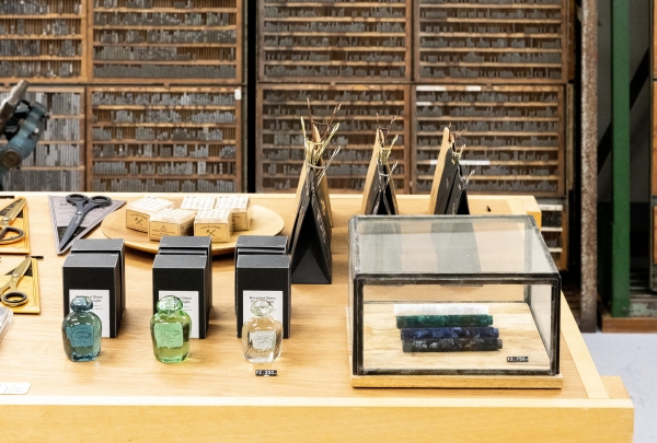 古い活字や印刷機の並ぶ空間をそのまま活かした店内では、厳選したハイタイドのオリジナルアイテムや国内外からセレクトした文具・手帳が並ぶほか、東京・蔵前にある文具店「カキモリ」ご協力の元、表紙や中紙を自由に組み合わせ自分だけのノートが作れるオーダーノートサービスを展開いたします。時には、活版印刷が体験できるワークショップも行います。