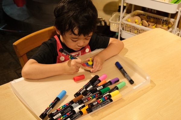 イベントではいろいろな素材に鮮やかに発色する水性サインペン「POSCA」を用いて、木製のコマをカラフルにデザインし、実際にコマを回して静止時と回転時の色や柄の変化を体感できるワークショップを実施しました。(所要時間約20分)
