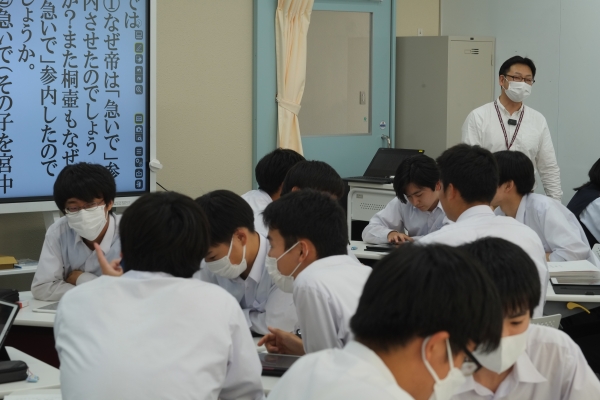 そこで、先生と生徒、双方向の授業スタイルを取り入れながらICT学習支援ツールを活用。授業前に別途チャットツールで生徒たちが与えられた課題についてディスカッションを行い、そこで話し合った内容、考えた内容をClassPad.netのデジタルノート機能でまとめて、先生にオンラインで提出します。集まったデジタルノートを元に、生徒の思考過程を辿りながら、生徒の思考力を伸ばすことを目的とした古典の授業を田口教諭が展開していきます。授業では古文の読解にあたりグループワーク、グループディスカッションも実施。生