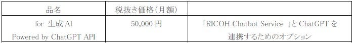 * 「RICOH Chatbot Service」のUIをChatGPTと連携することに特化した新プラン「カンタンシステム連携 for 生成AI Powered by ChatGPT API」もあわせて提供を開始します。