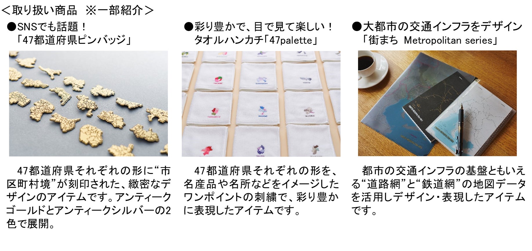 日本全国の詳細な地図を用いてデザインした、ピンバッジや文具、雑貨など豊富なラインナップを取り揃えています。日本土産に、旅路のお供に、ぜひお買い求めください。ご来店を心よりお待ちしております。