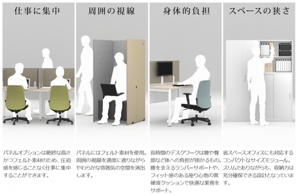 今回発売の「Justus」は、「私たち(us)」にとって「ちょうどいい(just)」を実現するオフィス家具シリーズです。デスクやパネル、ソファ、チェア、収納の全200アイテムをお求めやすい価格で一挙販売(※1)します。お客様の悩みを解決することを目的としながら、「ちょうどいいサイズ」「ちょうどいい機能」「ちょうどいい価格」という中身をしっかりと考えた商品です。