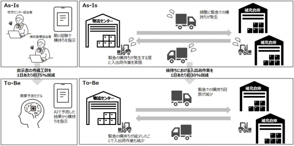 物流センターや補充倉庫の担当者が手運用で行っていた作業がAI需要予測モデルに置き換えられ、工数削減。
