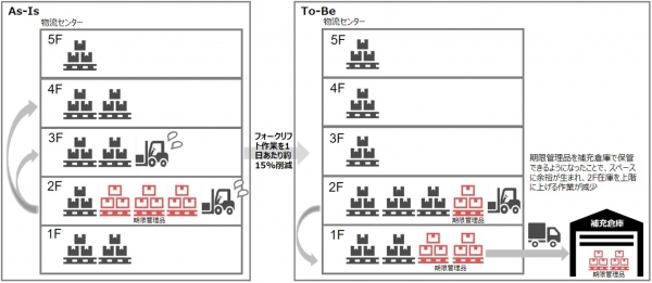 賞味期限や使用期限のある「期限管理品」と呼ばれる商品が以前は物流センター2階のスペースを占領し、スペース不足から一時的に上の階に移動させる作業が日常的に発生していた。しかし、今回のAI需要予測モデルの活用によって期限管理品を期限ごとに日次で細かく管理できるようになったことで、戦略的に補充倉庫で保管できるようになり、上の階に移動する頻度が減少。結果、作業時間の大幅な削減に。