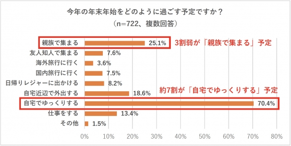 今年の年末年始は約7割の人が自宅でゆっくりする予定であることがわかりました。また、「自宅でゆっくりする」に次いで3割弱の人が「親族で集まる」と回答したことから、人の交流が活発化することが予想されます。ま